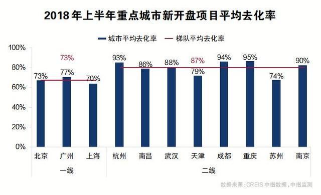 “去化率”是指銷售量與供應(yīng)量的比率,是衡量房地產(chǎn)銷售狀況的一個(gè)重要指數(shù)。2018年上半年,全國(guó)14個(gè)重點(diǎn)監(jiān)測(cè)城市新開(kāi)住宅項(xiàng)目當(dāng)天去化率均值為89%。重慶、成都、杭州、南京4個(gè)城市去化率超過(guò)平均水平。近九成的去化率,證明目前房屋仍需求緊俏。